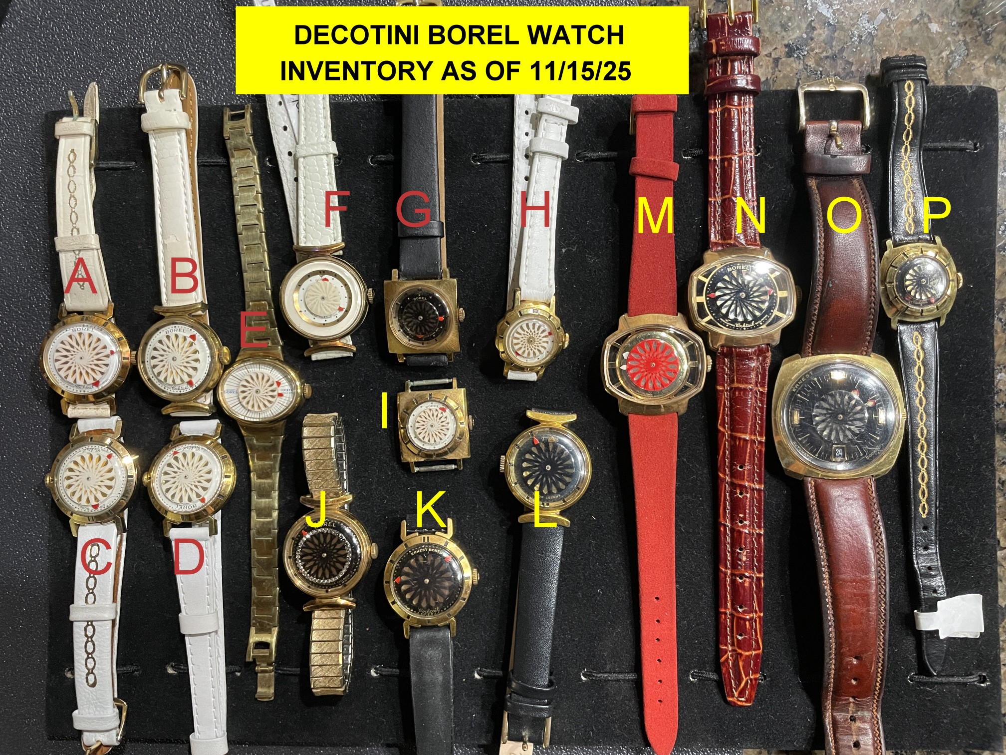 Here is our inventory as of November of 2025. Please contact us for pricing. Please refer to the letter on the photo.